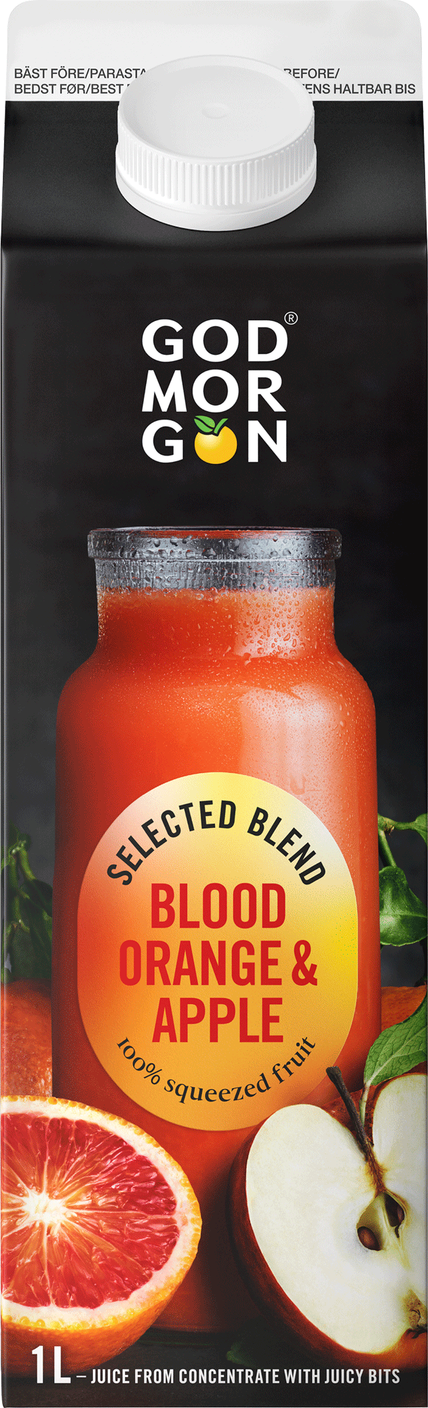 God Morgon Blodapelsin och Äpple består av en bas på våra milda och söta äppeljuicer tillsammans med blodapelsin som tillför en djup rödaktig färg och en naturlig friskhet som passar perfekt till frukostjuicen på morgonen.