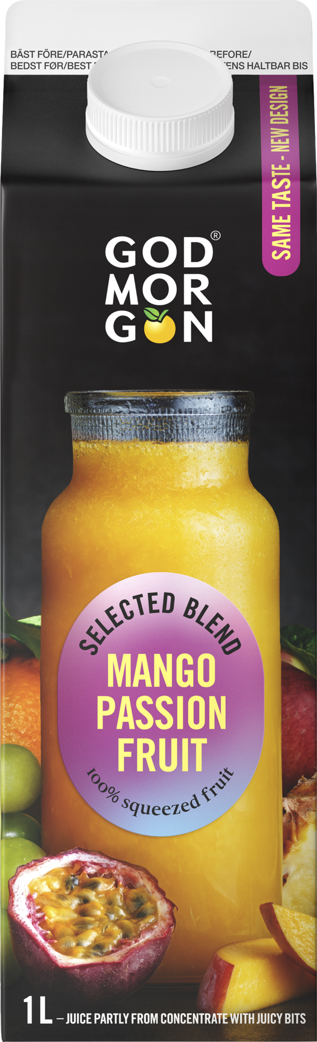 God Morgon® Mango Passion Fruit är en härligt god juice med smak av söt mango och syrlig intensiv passionfrukt.