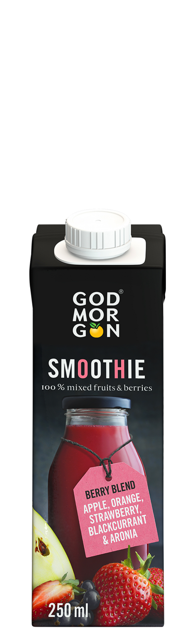God Morgon®Berry Blend Smoothie kommer från de bästa handplockade apelsinerna, noga utvalda jordgubbar, äpplen, svarta vinbär samt aronia bär. En smakrik och energigivande smoothie som passar perfekt till morgonen eller under dagen.