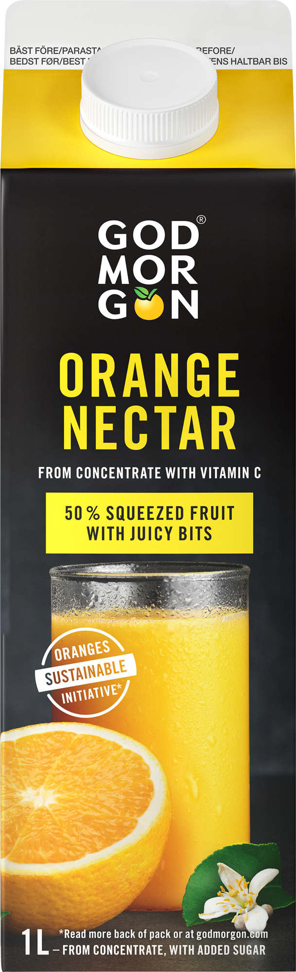 God Morgon® Orange Nectar är en apelsinnektar med 50% apelsinjuice med fruktkött, vatten och en hint av socker.
