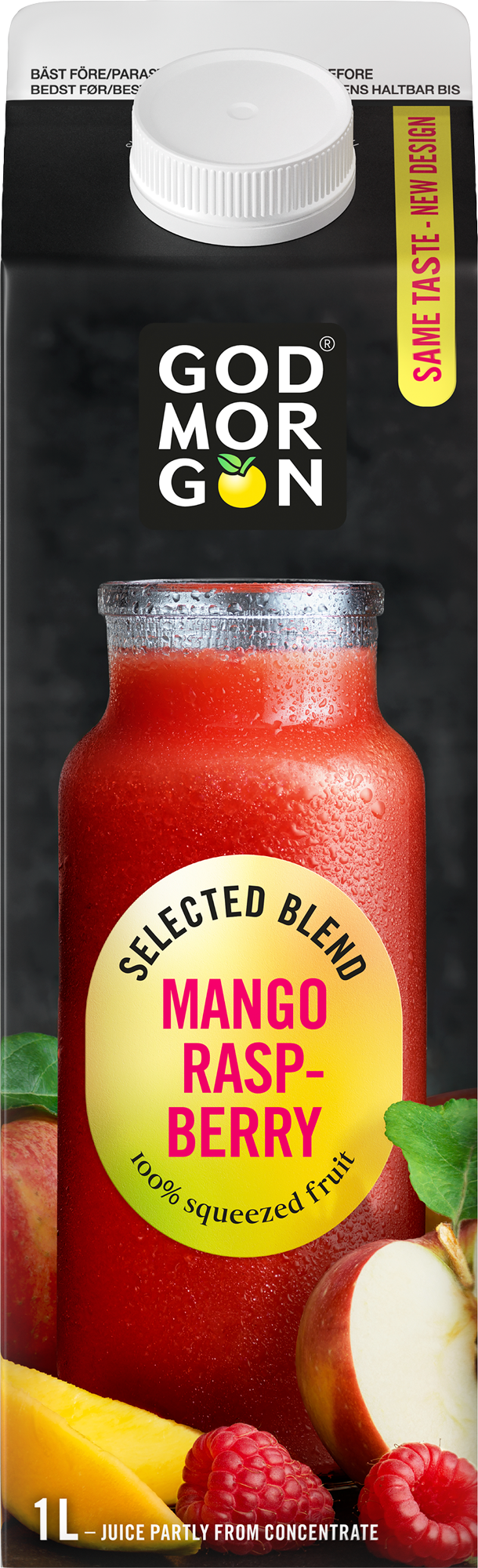 God Morgon® Mango & Raspberry är en sensationell och balanserad blandning av exotisk mango och söta hallon med en bas av äpple.