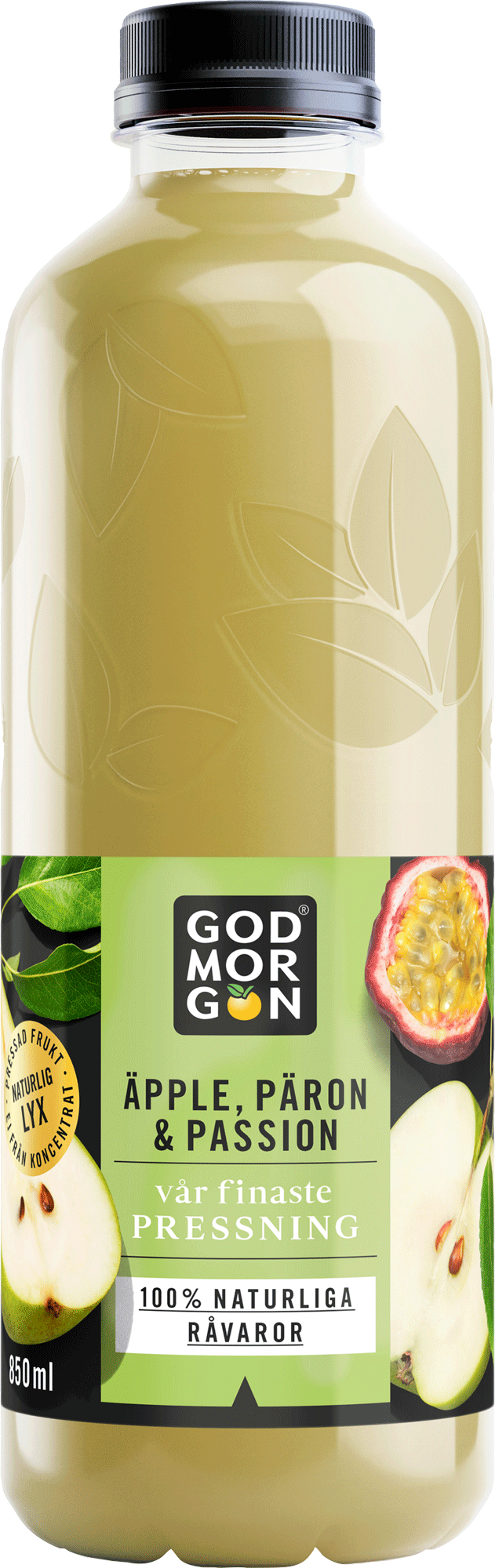 God Morgon® Äpple, Päron och Passionsfrukt är vår finaste pressning som består av en modern smakkombination av ofiltrerat äpple, päron och en hint av karaktäristisk passionsfrukt för naturlig lyx. 100% naturliga råvaror, ej från koncentrat.