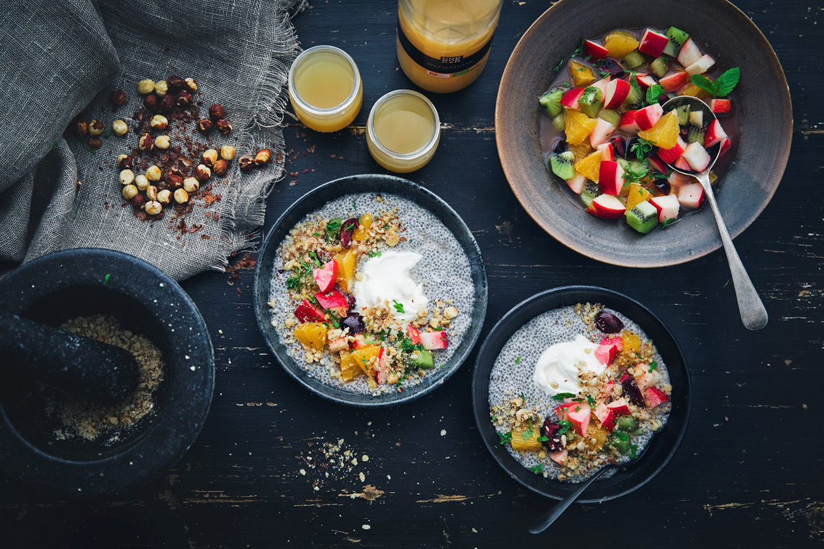 Häll upp i två skålar eller glas med chiapudding, toppa med fruktsallad och lite marinad, hasselnötskross och färsk mynta.