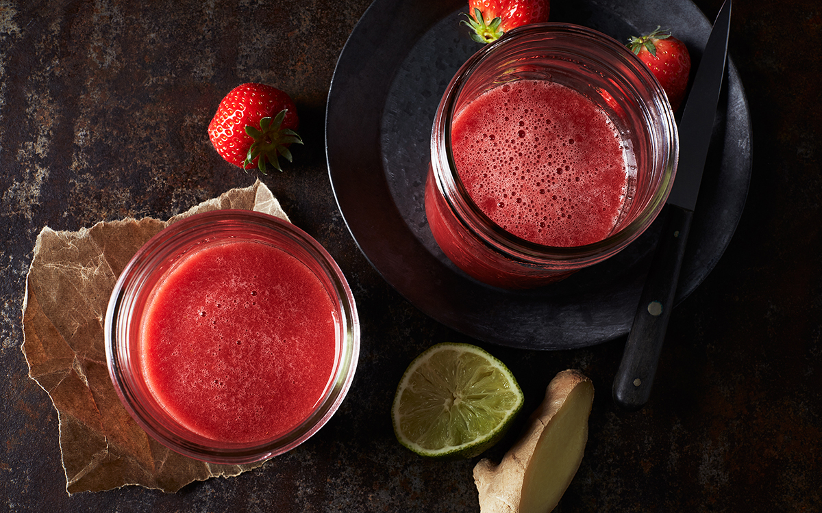 Mixa juice, jordgubbar, ingefära och lime. Lägg rikligt med is i 2 glas och häll på juicen.