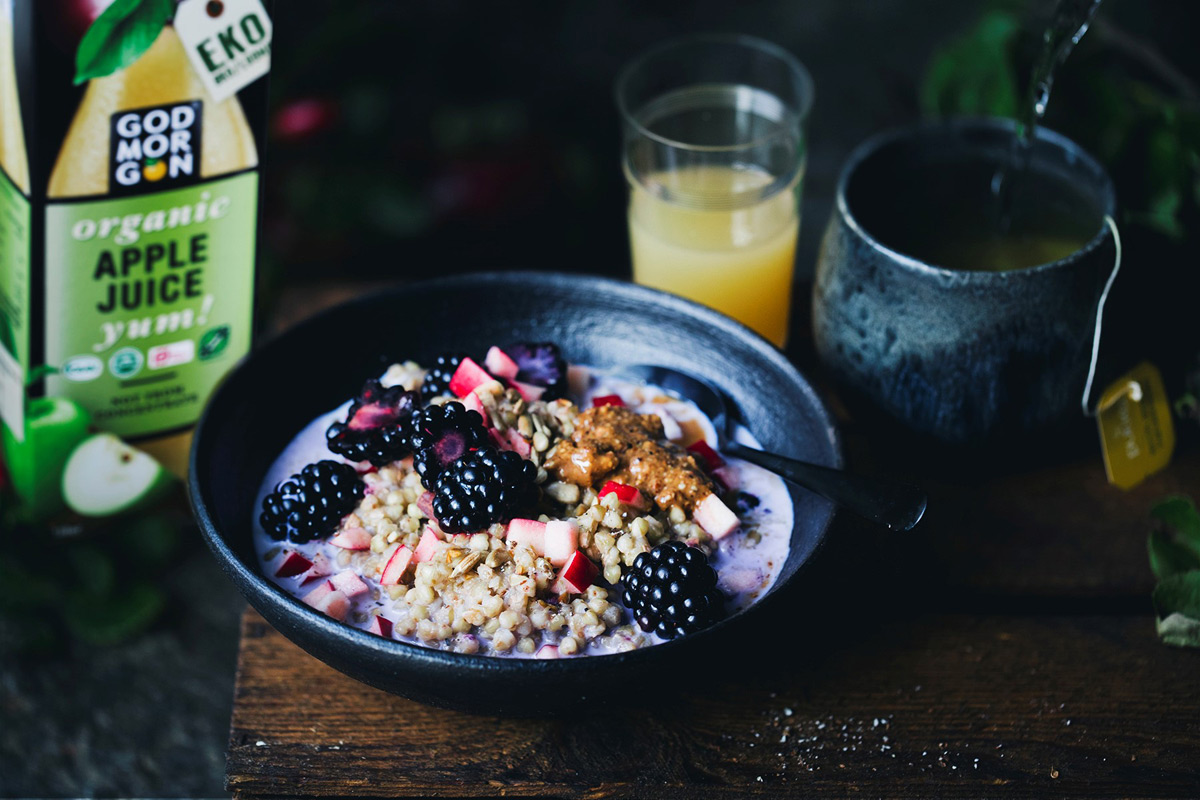 Davids mamma lärde sig laga bovetegröt på ett yogaläger och sedan dess har den nästan konkurrerat ut havregröt hemma hos oss. Bovete har en skönt tuggig konsistens och blir supergod, särskilt om den kokas i hälften äppeljuice, hälften vatten och med mycket varma kryddor. Den behöver lite längre tid än havregröt men då brukar vi passa på att göra allt det där morgonviktiga medan den kokar. Ta på kläder, göra tandborstar och ytterkläder redo vid dörren, tända ljus, sätta på musik på högsta volym (förlåt grannar!), dansa tokig dans (obligatoriskt för att få morgontrötta barn på bra humör) och sedan sätter vi oss ner och äter farmors yogagröt tillsammans. /Luise, Green Kitchen Stories